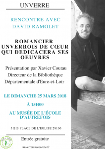 (Projet Initiative et Communication), nous avons réalisé un événement avec le musée d’école d’autrefois d’Unverre (28160). Cet événement était organisé sous la forme d’une conférence avec le romancier David Ramolet, ancien élève de l’école de ce petit village et auteur de 7 livres. L’animation de cette rencontre fut menée en collaboration avec Xavier Couteau, Directeur de la Bibliothèque Départementale d’Eure et Loir.