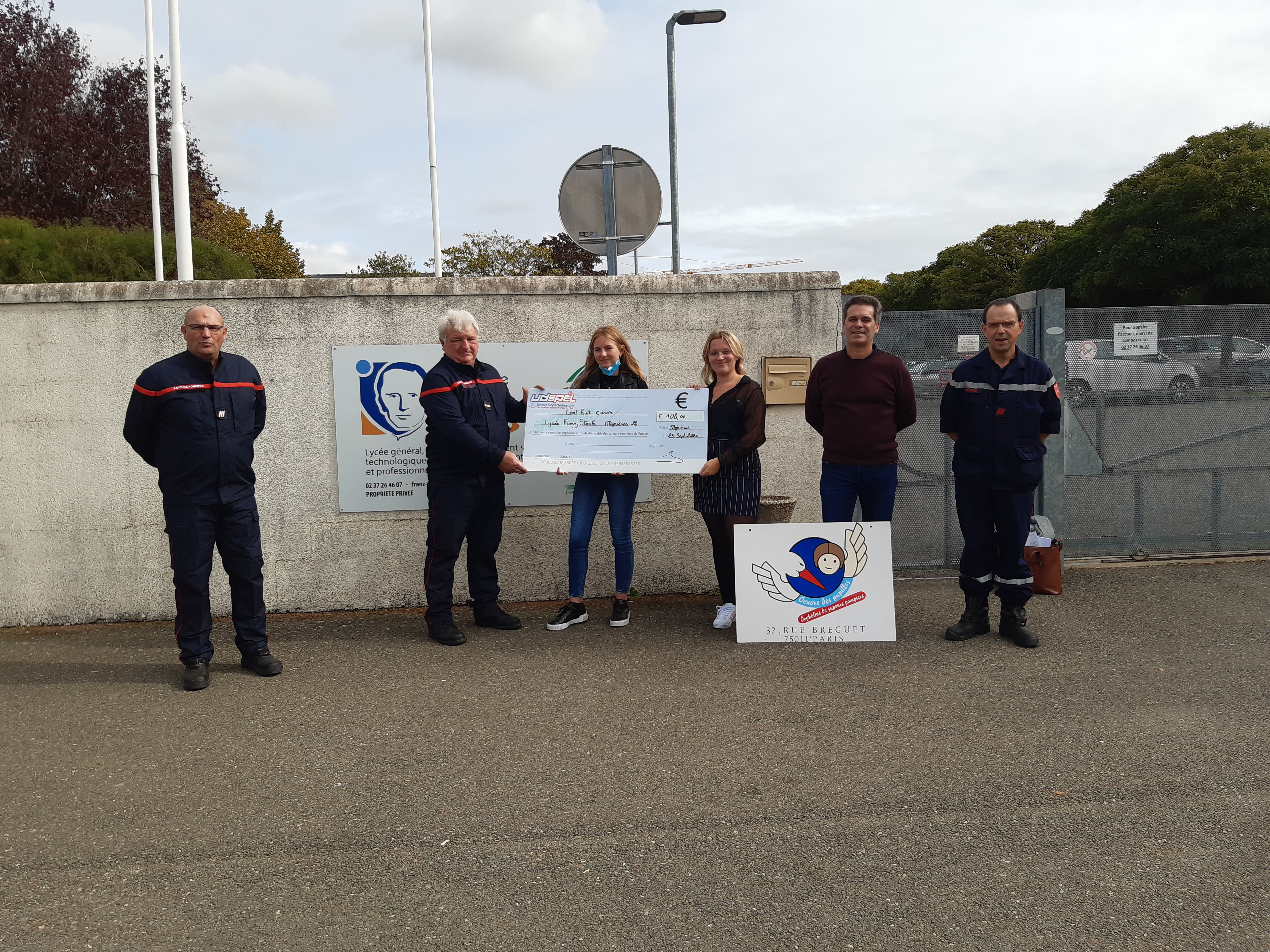 Le 29 Octobre 2020, une cérémonie fut organisée au lycée pour la remise du chèque de 108€ avec la présence de Mr. Guichard (directeur adjoint du lycée), Fréderic Dessenne, Sylvain Monsimier (responsable de la mission volontariat du SDIS 28), Jean-Pascal Nicole (représentant de l’union départemental du SDIS 28) et des 2 organisatrices du projet Chloé P et Chloé R.