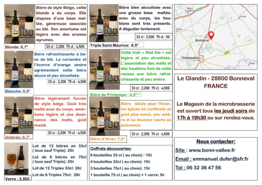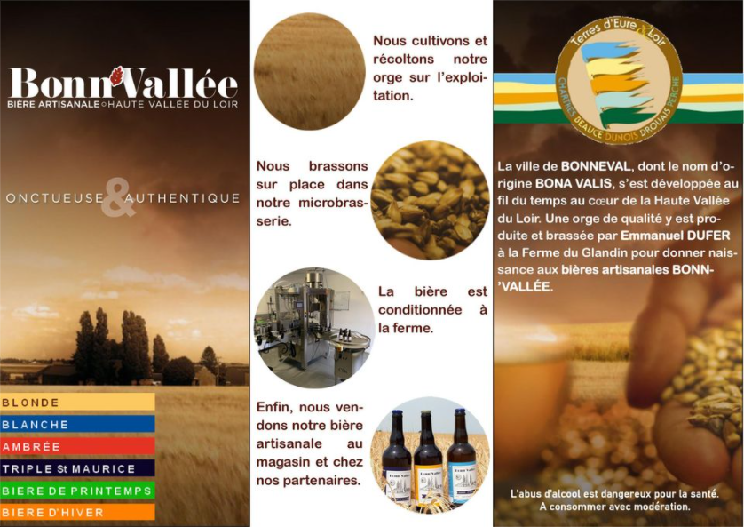 En tant qu’élève en 2ème année de BTSA Développement, Animation des Territoires Ruraux, j’ai réalisé 13 semaines de stage à la microbrasserie de la Bonn’vallée au Glandin à quelques minutes de Bonneval (Eure-et-Loir). C’est une brasserie artisanale produisant 7 types de bières différents qui sont Blonde, Blanche, Ambrée, Triple-Saint-Maurice, bière d’Hiver, bière de Printemps et la 3ème Mi-Temps.